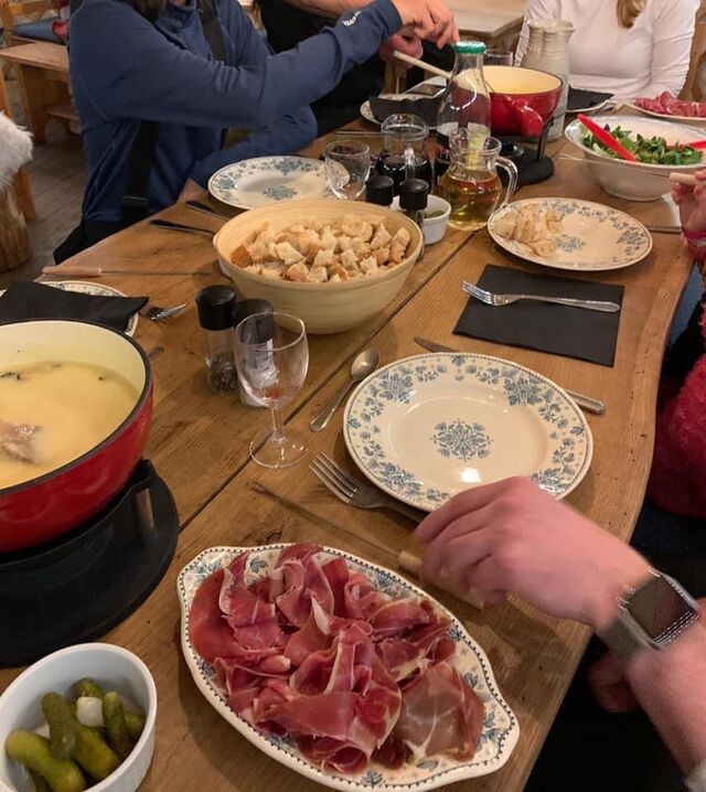 Apéritif/Fondue Savoyarde Nature ou Cèpes/Charcuterie Salade verte/Vin/Dessert